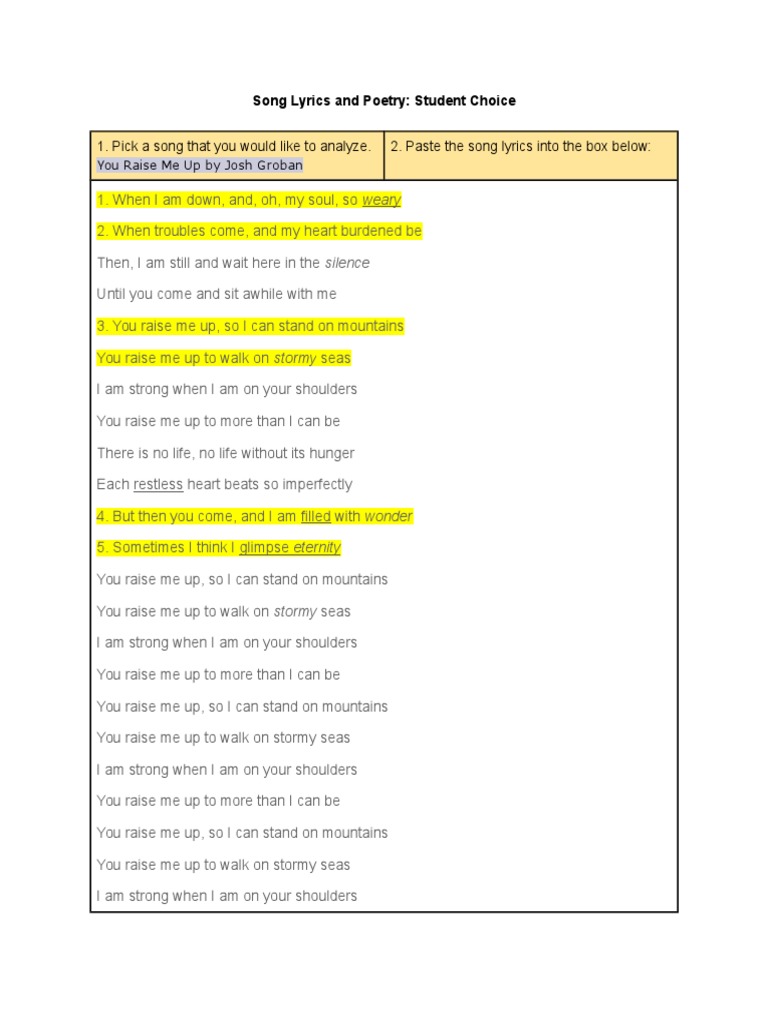Lyrics Center You Raise Me Up Lyrics And Chords Pdf